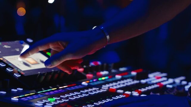 Professional sound engineer adjusting audio mixer in music production studio with vibrant neon lights generative ai
