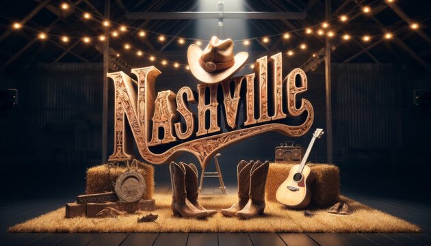 Nashville country music scene with cowboy boots and guitar, perfect for music festivals, country lifestyle, and southern culture marketing
