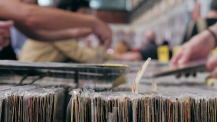 Woman is choosing a vinyl record in a musical store