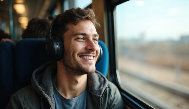 Adult bearded smiling sportsman walking with headphones and mobile phone enjoying listening to music outdoors on urban city park. Happy joyful male athlete in black sportswear relaxing after training