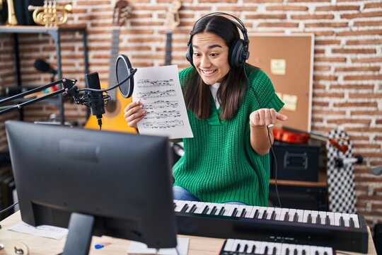 Young south asian woman doing online music tutorial showing music sheet screaming proud, celebrating victory and success very excited with raised arm