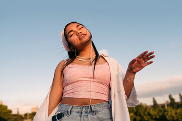 A young woman enjoying music with headphones, set against a vibrant, colorful background.
