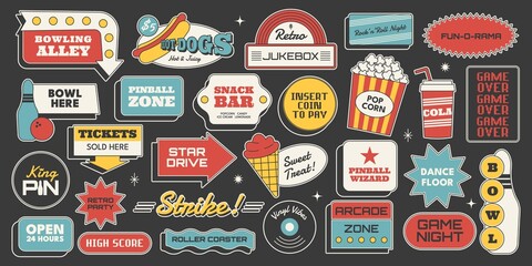 Retro sticker set. Bowling, arcade, jukebox, hot dog, popcorn, cola and entertainment signs in midcentury 50s style. Vector illustration for fun, party, posters, retro vibes