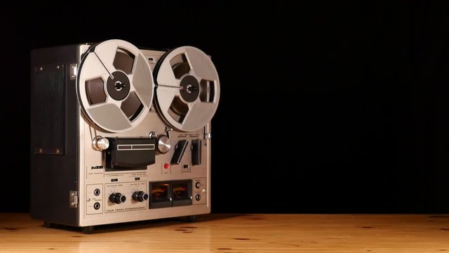 Reel to Reel tape recorder playing music isolated on black bakcground and space for copy