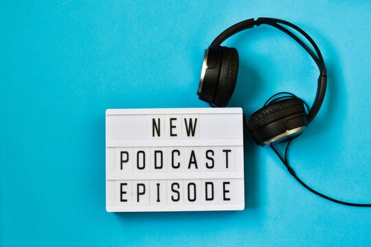 Top view of words NEW PODCAST EPISODE on light box on blue background with headphones. Podcasting concept.
