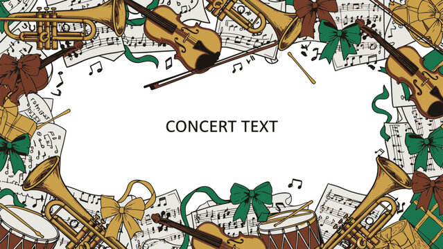 Elegant Hand-Drawn Musical Christmas Border Adorned with Orchestral Instruments and Ribbons for Holiday Themes