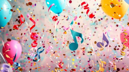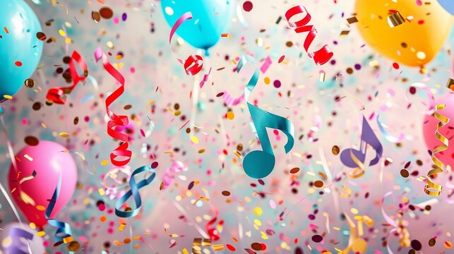 Colorful Celebration with Balloons, Confetti, and Musical Notes