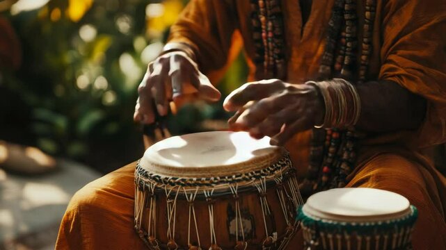 Close Up Of Hands Playing Traditional Tabla Drums With Warm Lighting And Rich Details Showcasing Cultural Music Performance And Artistry
