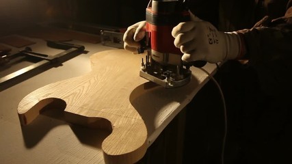 Heavy Duty Plunge Router  treats the edges of the body of a wooden guitar
