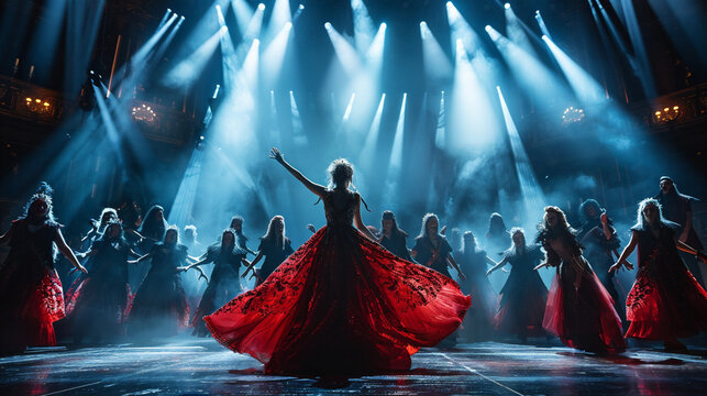 Musical theater performance with live orchestra and vibrant costumes