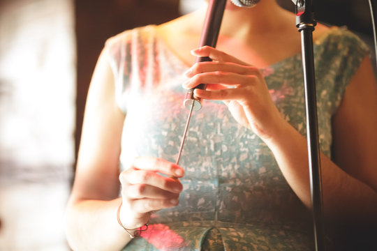 The AI is a holographic interface of swirling sound waves and glowing light, and the musician is seen manipulating the interface with their hands