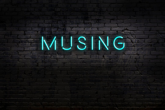 Neon sign. Word musing against brick wall. Night view