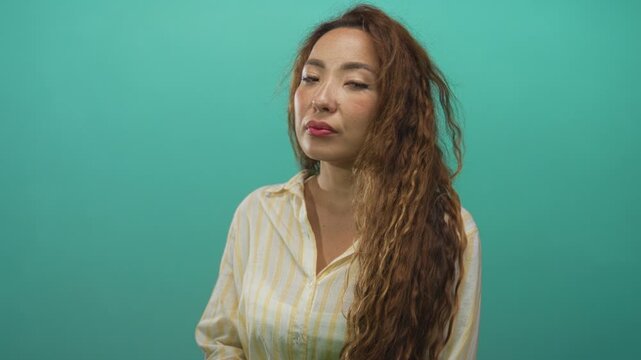 Woman looking sideways with long wavy hair and visible face in studio with teal backdrop; quiet contemplation.