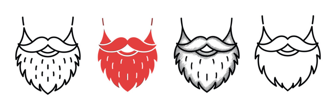 Set of four beard and mustache icons in various graphic styles, including simple black line art, a bold red silhouette, and a detailed hand-drawn sketch illustration