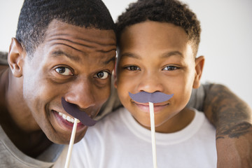 Father and son playing with fake mustaches