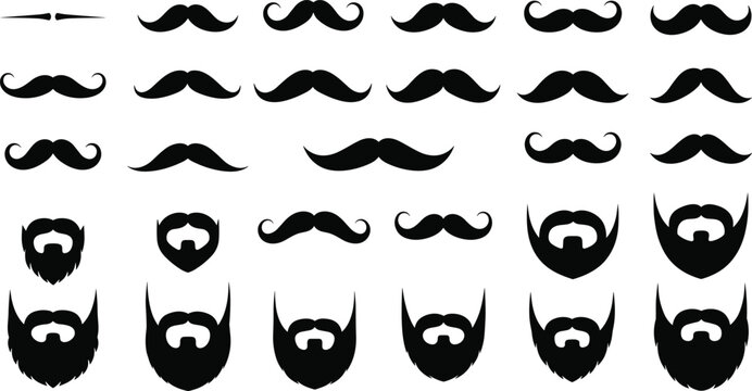 Silhouettes of various mustache and beard styles in black, ideal for grooming reference, character design, fashion, and icon creation