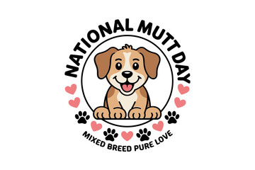 National mutt day badge with cute puppy and hearts, paw print wreath, mixed breed pure love vector illustration