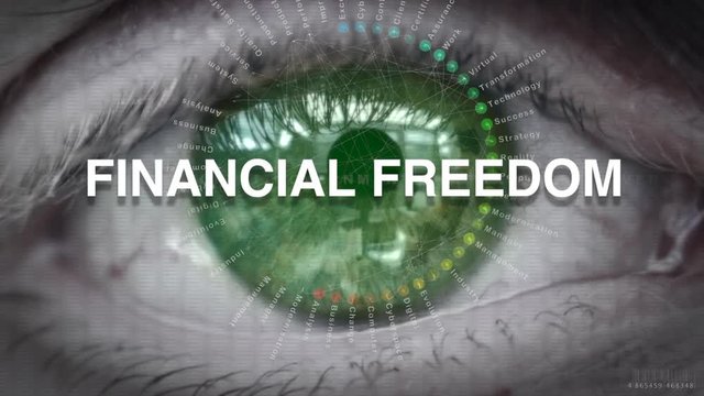 Close up of an eye focusing on a Financial Freedom a futuristic screen.