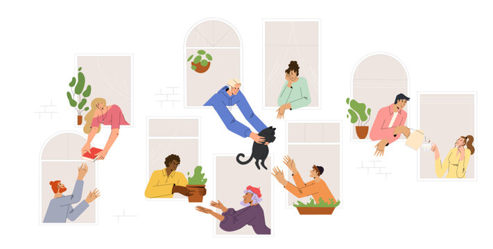 Neighbors sharing things and helping each other through open windows of house. Concept of good neighborhood, people's unity, mutual aid and support. Colored flat vector illustration isolated on white