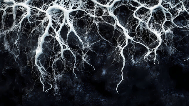 Underground view of a mycelium network, white threads intertwining through soil, highdetail, dark and moody colors, illuminating fungal roots, closeup. Subterranean Threads. Illustration