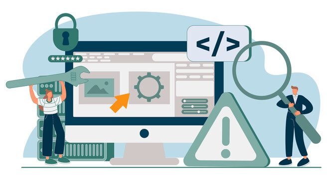 PHP and MySql development metaphor. Software website developer with computer, programmer service, open source general purpose programming language. Scripting web applications allows to create programs