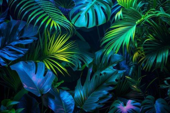 Lush tropical foliage with vibrant green and blue neon lighting Exotic and mysterious ambiance