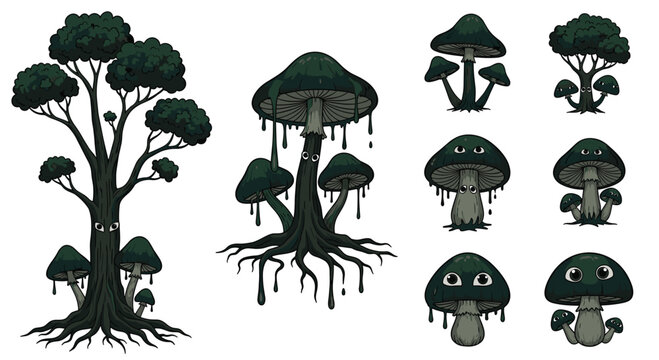Delightfully spooky mushroom and tree characters perfect for Halloween designs and whimsical storybooks with a cute mysterious vibe