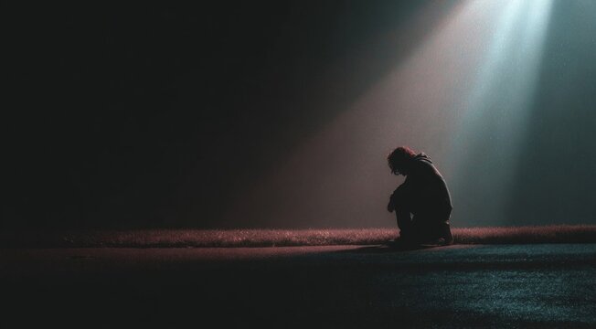 Solitary Figure in Darkness: A lone figure kneels in shadow, illuminated by a single beam of light, evoking feelings of solitude, contemplation, and hope.
