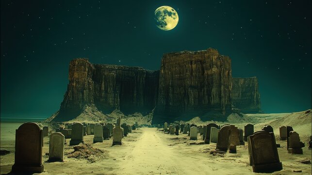 Eerie Graveyard Under a Full Moon and Misty Sky.