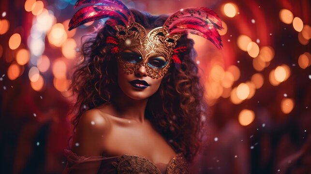 Beauty model woman wearing venetian masquerade carnival mask at party over holiday dark background with magic stars. Christmas and New Year celebration