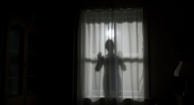 Silhouette of a person standing behind a closed curtain, illuminated by an unknown light source, creating a sense of mystery, suspense, and a hidden presence.