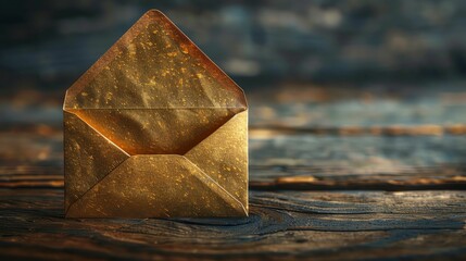 A golden envelope sits on a weathered wooden surface, its flap open, hinting at a secret message.