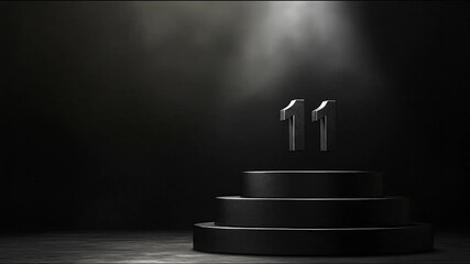 Dark stage with number 11 floating above round tiered stand, dramatic spotlight