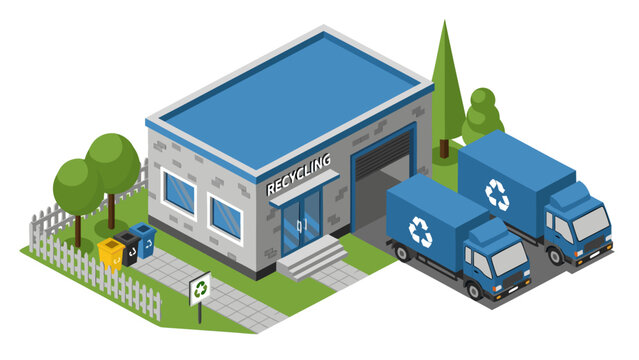 Recycling facility vector illustration with trucks and bins for waste management and sustainability