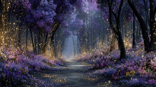 A mystical path winds through a forest of shimmering purple trees and golden lights. Ideal for fantasy designs, enchanting book covers, or magical journey concepts.