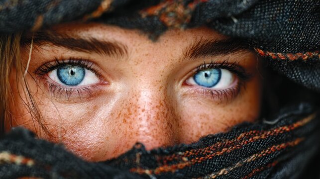 Close-up of woman's face, blue eyes, covered by a dark cloth