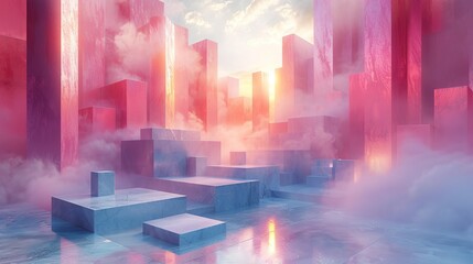 Three draped white spheres on a white platform, modern city backdrop, showcasing product unveiling or mystery concept