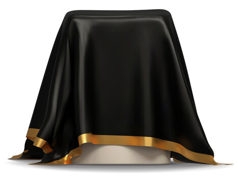 Round podium under golden satin fabric curtain cover. Realistic vector illustration set of gift or surprise that can be reveal and unveil. Product stand hidden in gold silk waved cloth blanket.