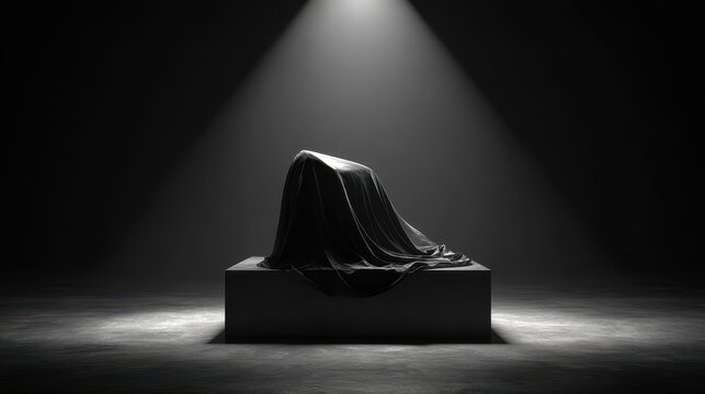 Object unveiled under cover, mystery box in the dark, spotlight. For promotion