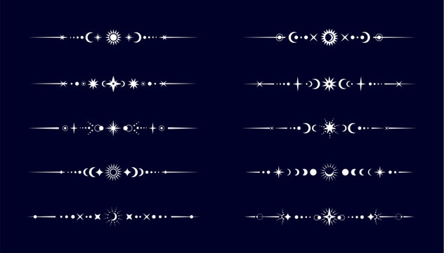 Esoteric mystic celestial divider borders vector set. Fantasy, space or magic golden lines with glowing mystical sun, crescent moon and star boho symbols. Astrology, wicca, witchcraft spiritual frames
