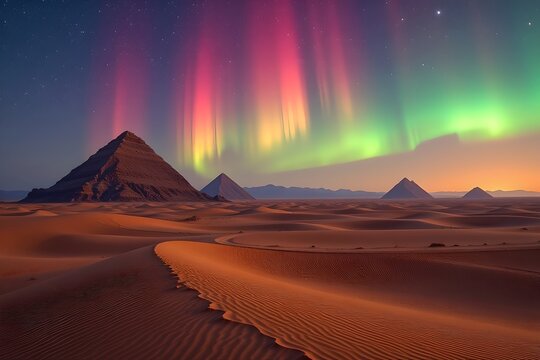 desert landscape with pyramid shaped dunes and aurora sky, bright and dreamy