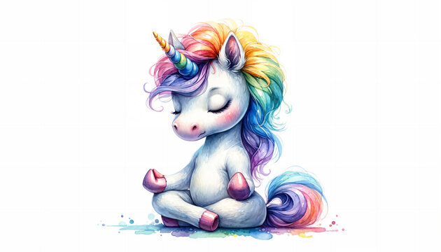 Watercolor illustration of colorful unicorn meditating in yoga lotus position. Cute and funny illustration