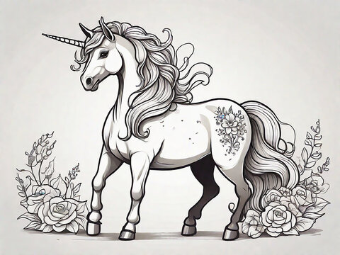 Illustration of a majestic unicorn standing on a fluffy cloud with a vibrant rainbow backdrop created with Generative AI technology
