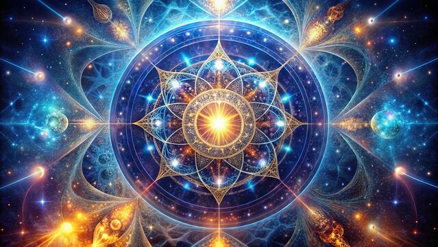 Philosopher stone sacred geometry spiritual new age futuristic illustration with transmutation interlocking circles, triangles and glowing particles in front of blurred background.