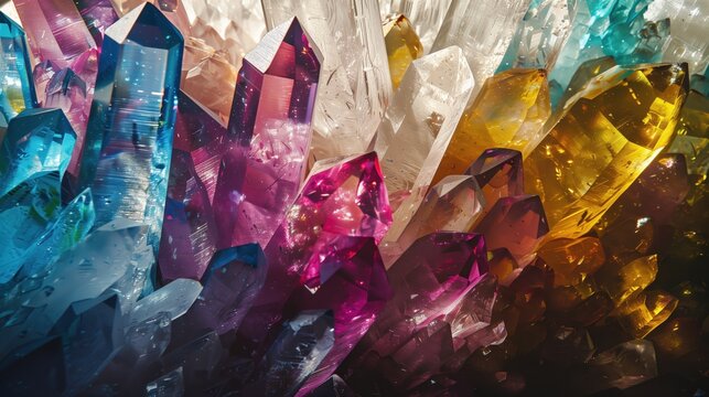 Healing minerals, stones, crystals background. Magic spells, cleansing practice, ritual, witchcraft. Colourful crystal background with copyspace