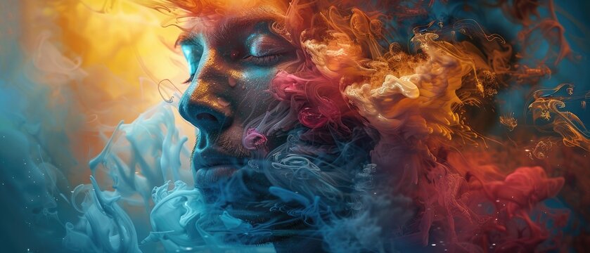 A surreal portrait blending vibrant blue and orange smoke with a serene face, evoking a sense of mysticism and tranquility.