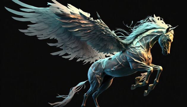 pegasus, a mythological animal, a horse with wings, gallops against the sky, generative ai