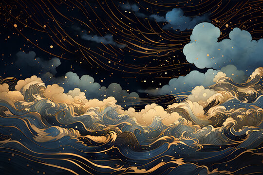 Abstract sea background with clouds, sea landscape, night, stars in the sky, greek mythology style, japanese woodblock art Design, Generative AI