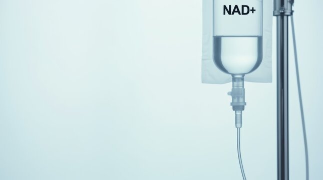 Close-up of transparent iv drip bag with NAD plus hanging from a metal stand for medical treatment