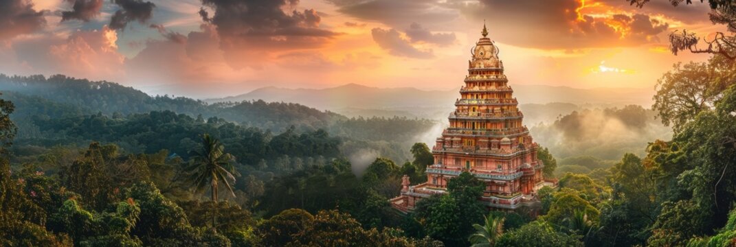 Majestic Hindu temple with jungle and mountains in the background, banner